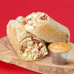Burrito con pollo loco, frijol y arroz en tortilla de harina grande 28 cm, incluye 1 salsa verde, 1 salsa roja .