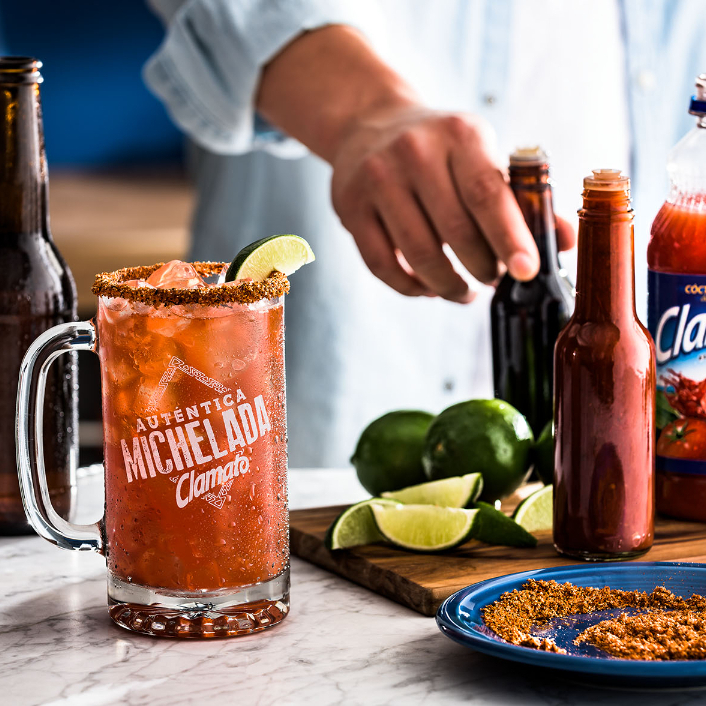 Vaso de litro con Clamato preparado.
