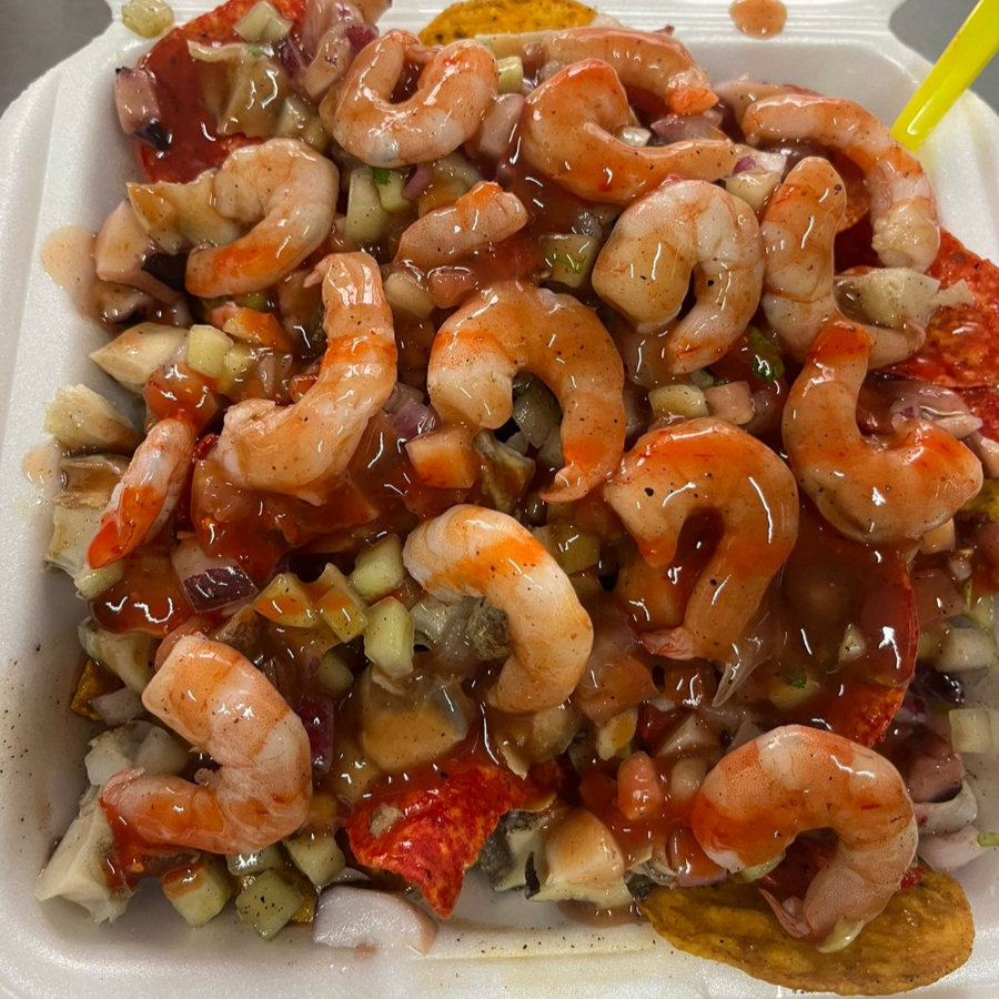 camaron, calamar, caracol, 2 tostitos de su eleccion, verdura