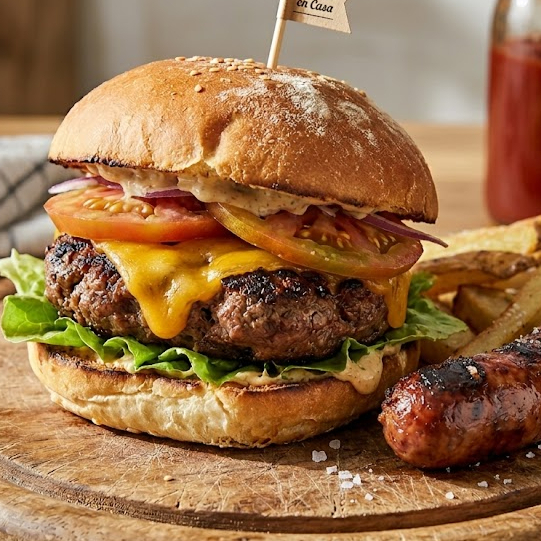 carne artesanal de res, queso, jamón, verduras y aderezos