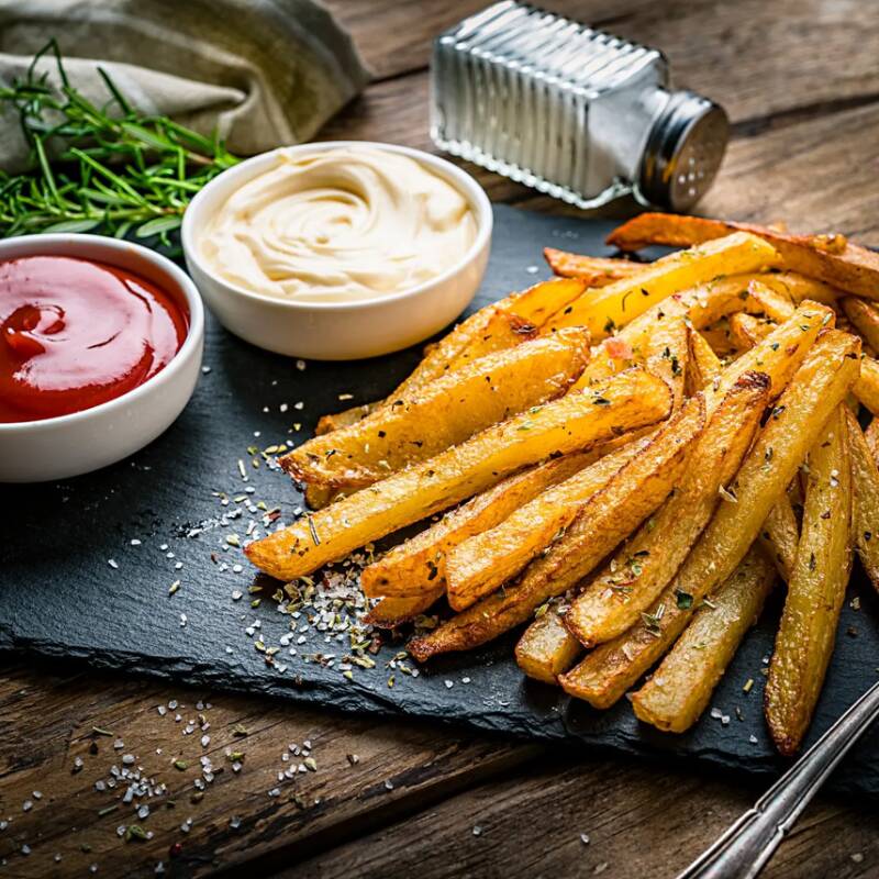 Papas doradas y crujientes por fuera, suaves por dentro, acompañadas de catsup. el clásico que nunca falla
