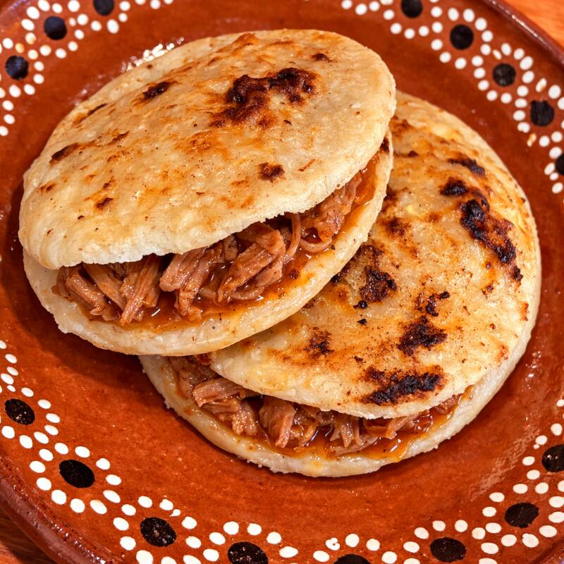Tradicional gordita de maíz rellena de guisado casero, dorada a la plancha con manteca de cerdo para un sabor auténtico.