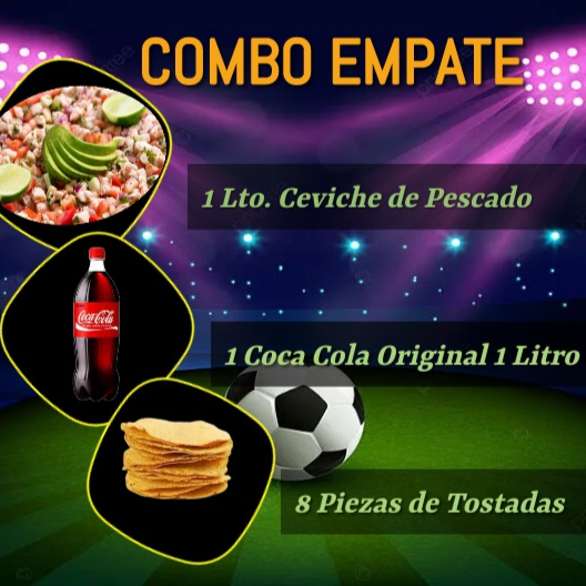 Este Combo de compone de: 1/2 de Ceviche de Pescado, 1 Filete de Pescado a Elegir, 1/4 de Sopa a elegir, 1/4 de Guarnicion a Elegir, Tostadas, 1 Paquetin de Tortillas, 1 Paquetin de Tostadas, Salsa, 1 Coca Cola de 1L y Cubiertos