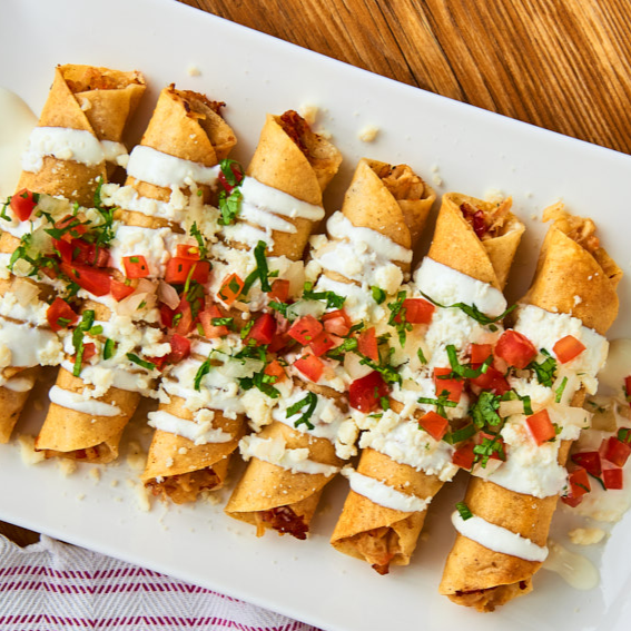 5 Flautas surtidas de requesón, frijoles, rajas, picadillo y papa. Servidas con lechuga, salsa del día, y 1 vaso de 12oz de agua de sabor del día.