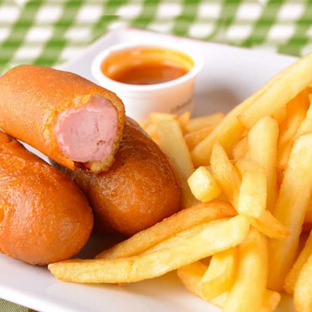 Banderillas que se acompañan de papas fritas, sobres de capsup, mayonesa, agua de sabor, cubiertos y snack.