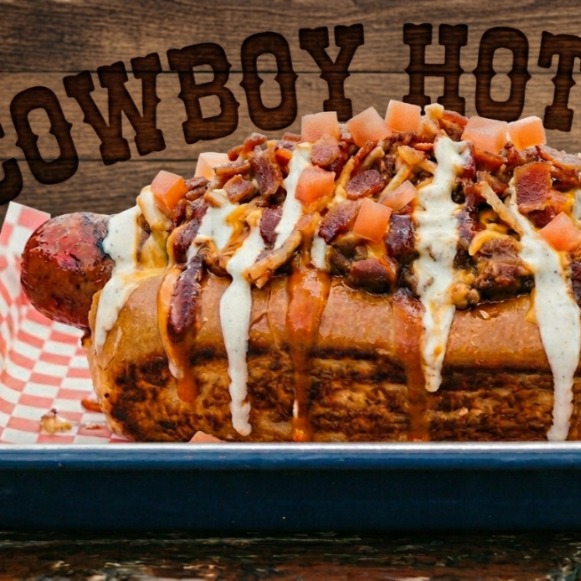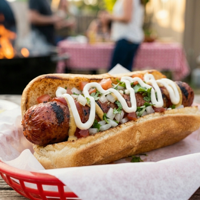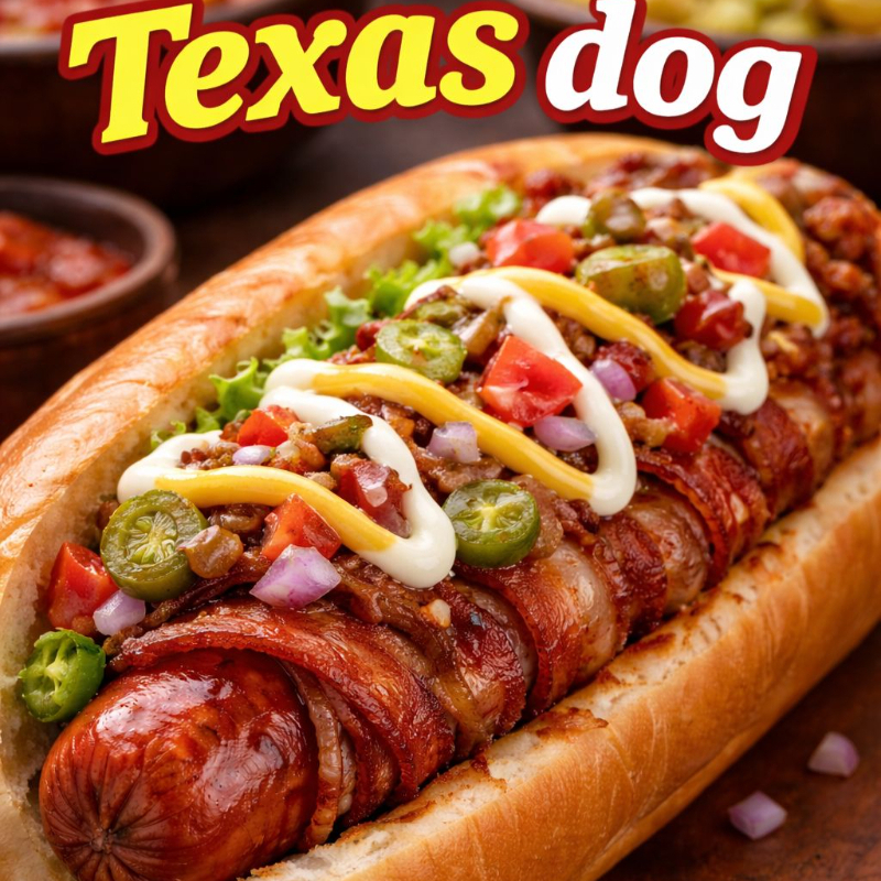 (Pan,Salchicha jumbo con tocino,aderezo ranch,BBQ, y salsa Bufallo , tomate y cebolla)