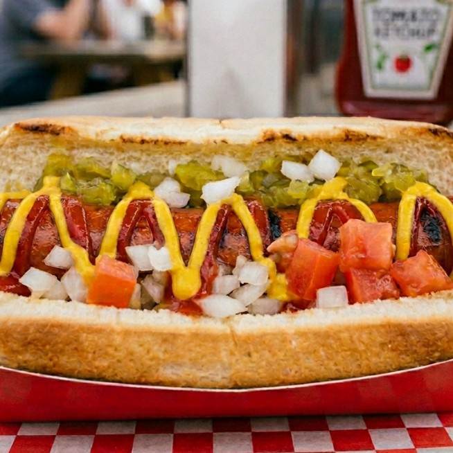 (Pan, salchicha jumbo, cebolla caramelizada, aderezos y tomate.