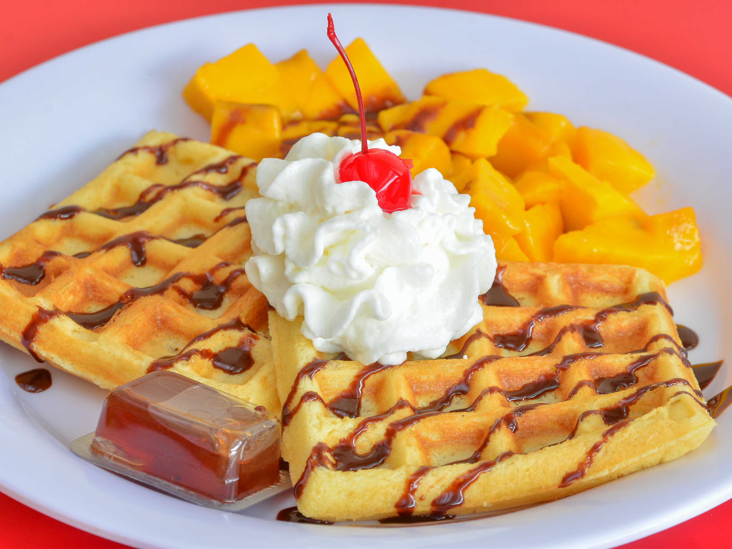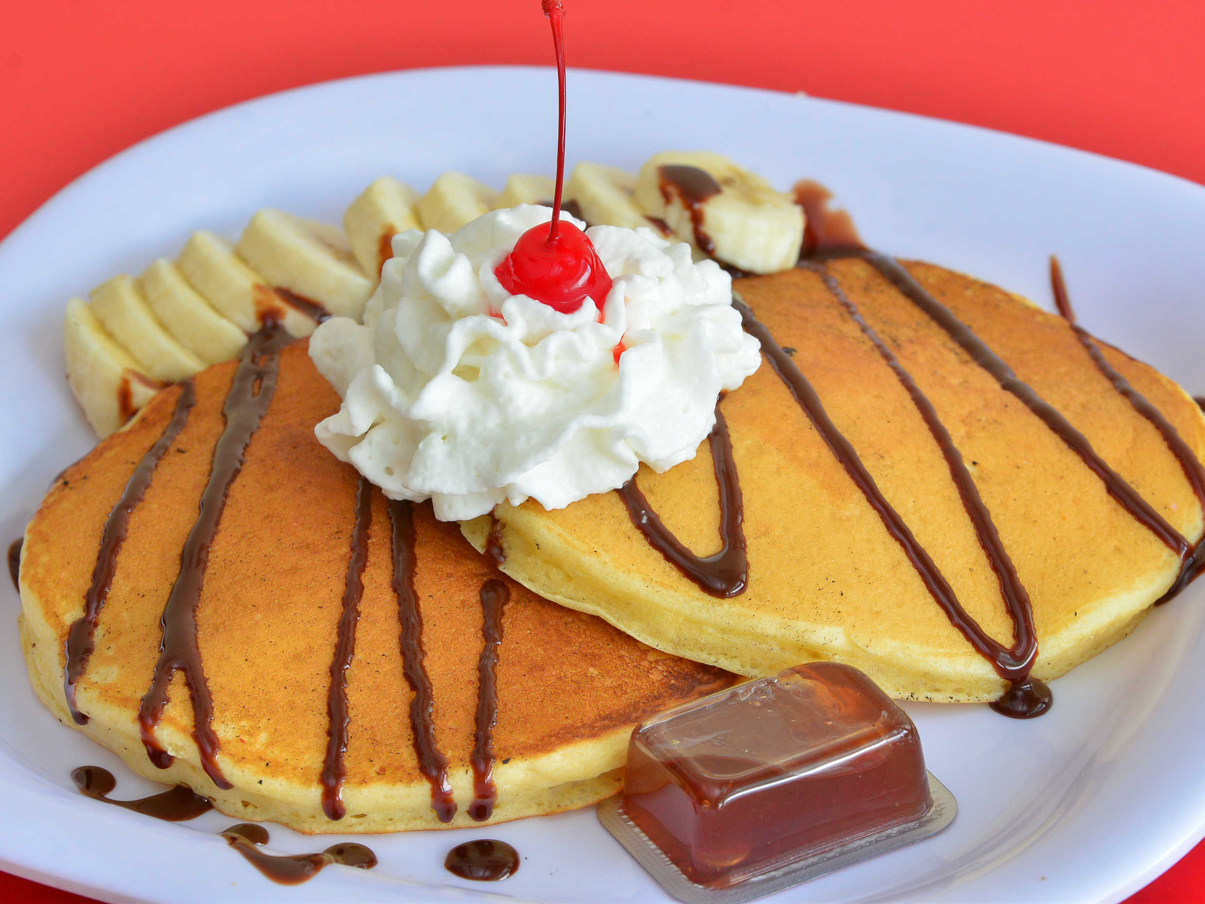 2 Rollitos de jamón con queso, 1 huevo revuelto o estrellado y 1 mini hot cake.