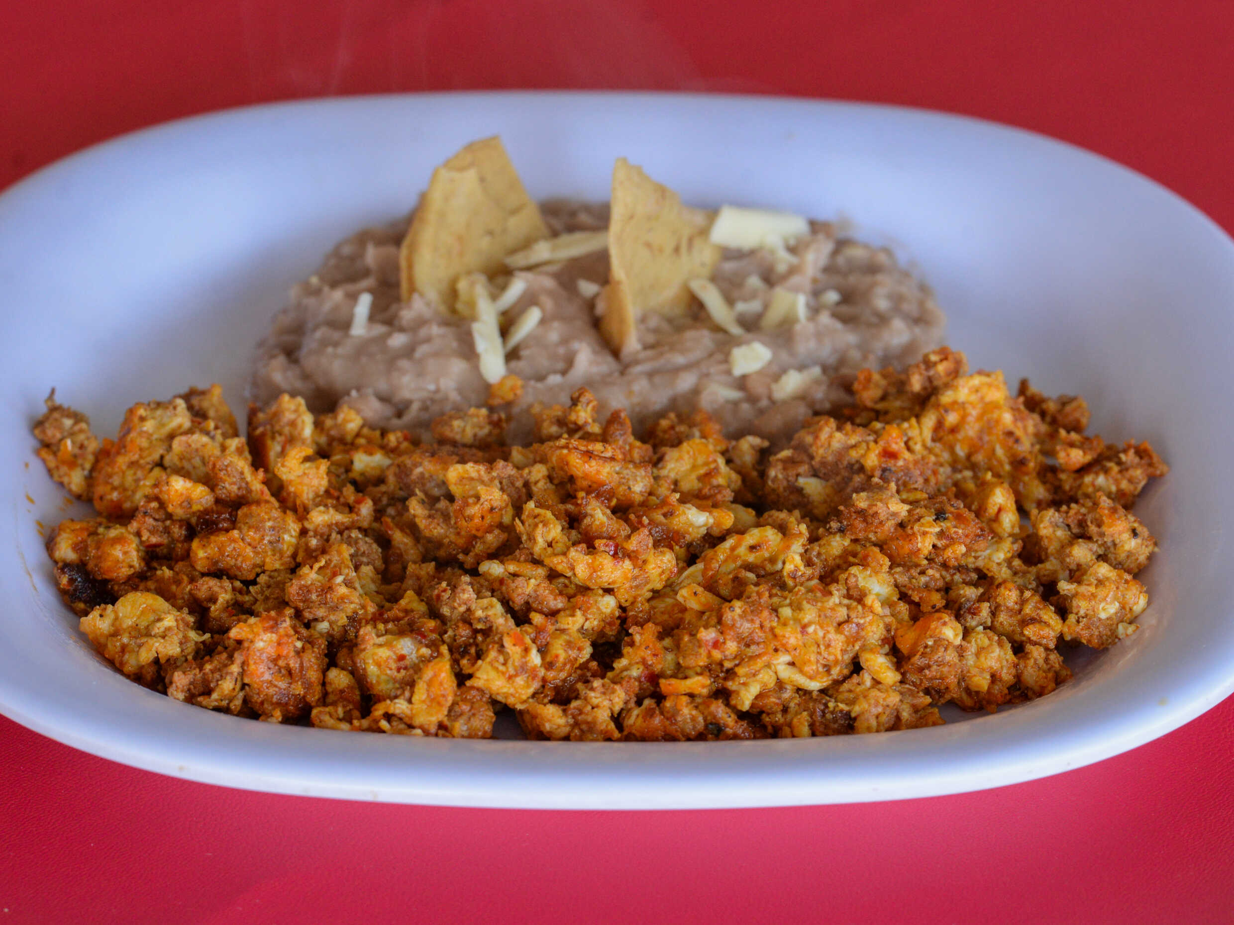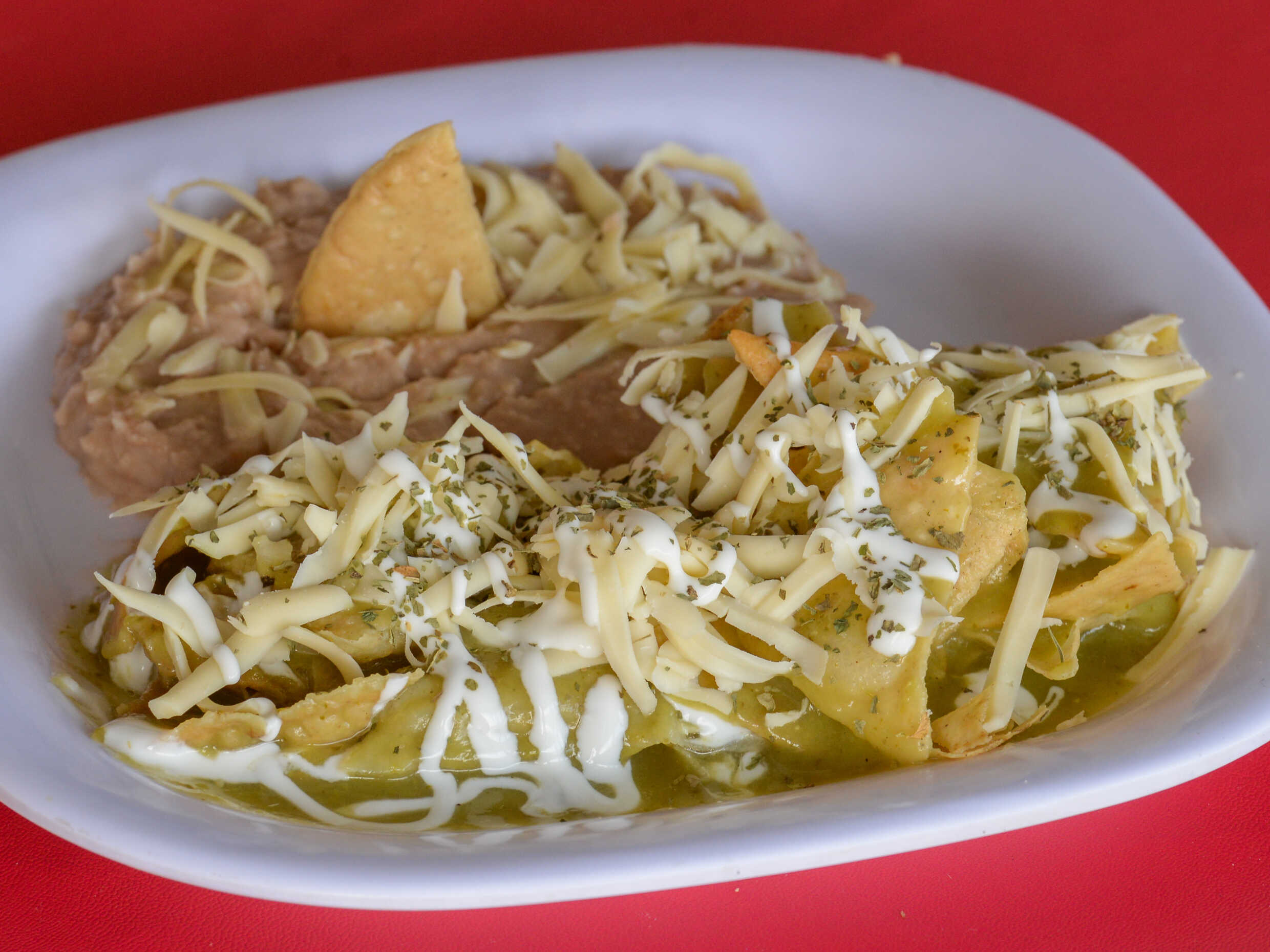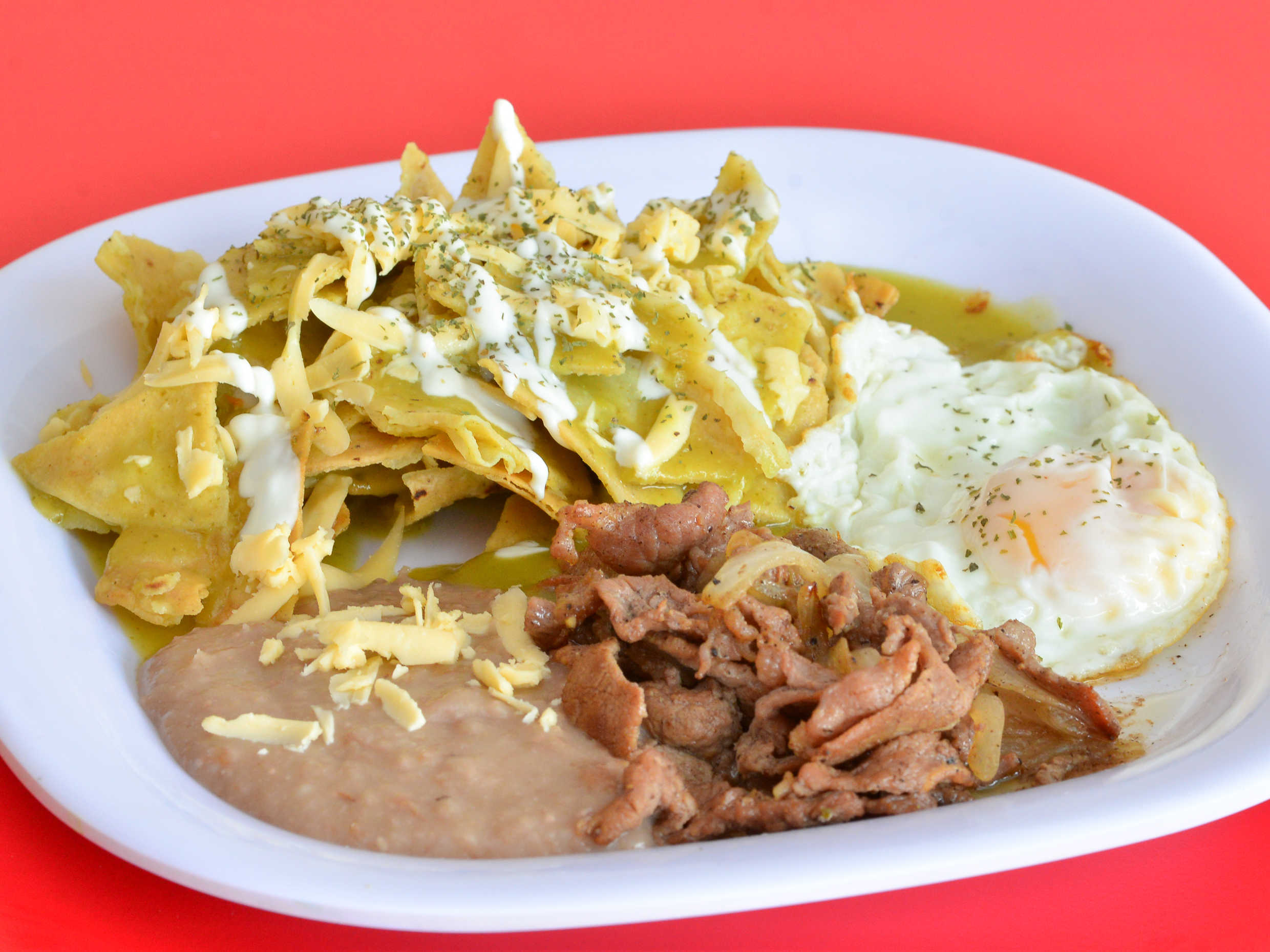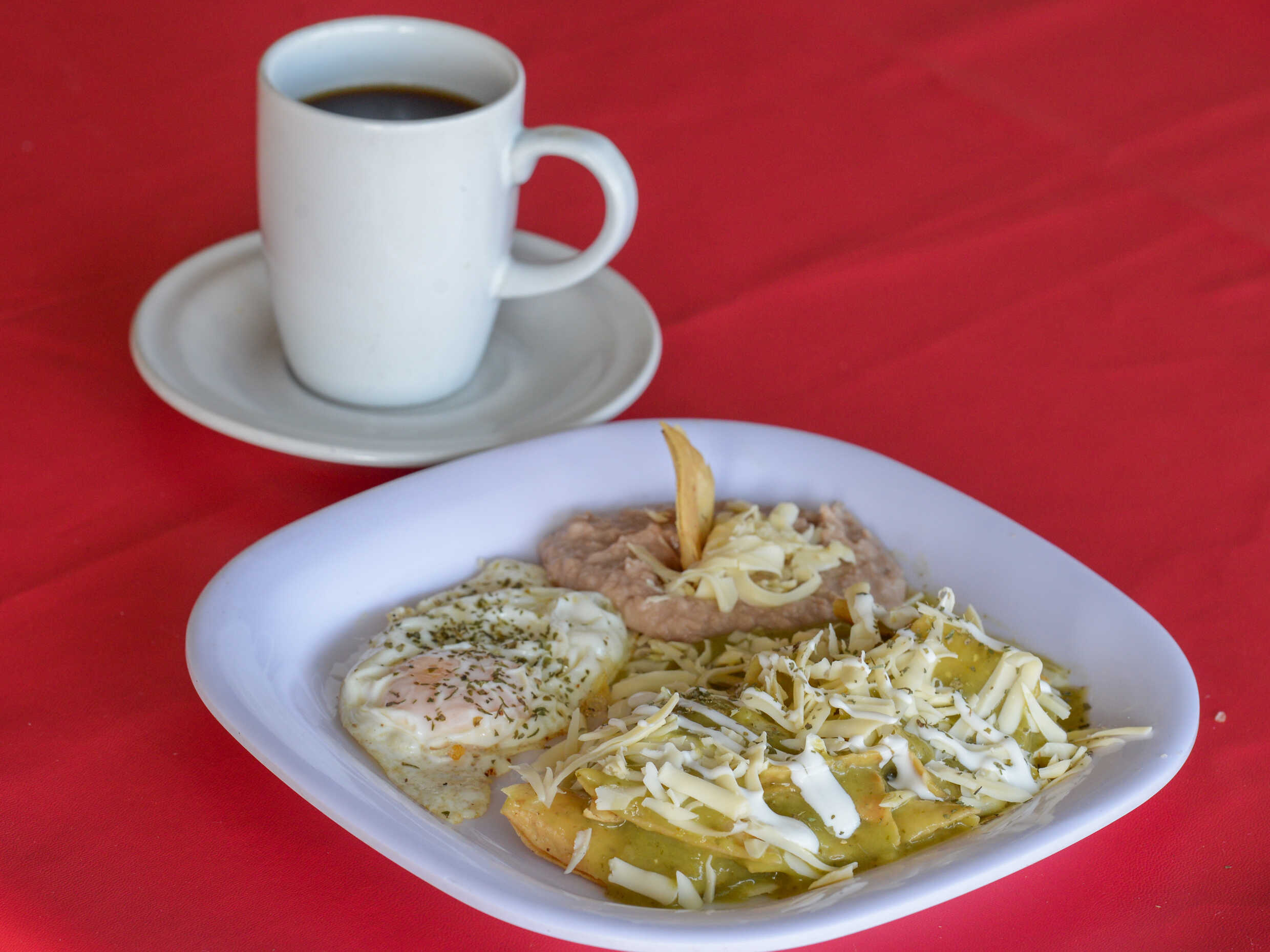 Chilaquiles verdes o rojos, bistec, 1 huevo estrellado y frijoles refritos, incluye café.