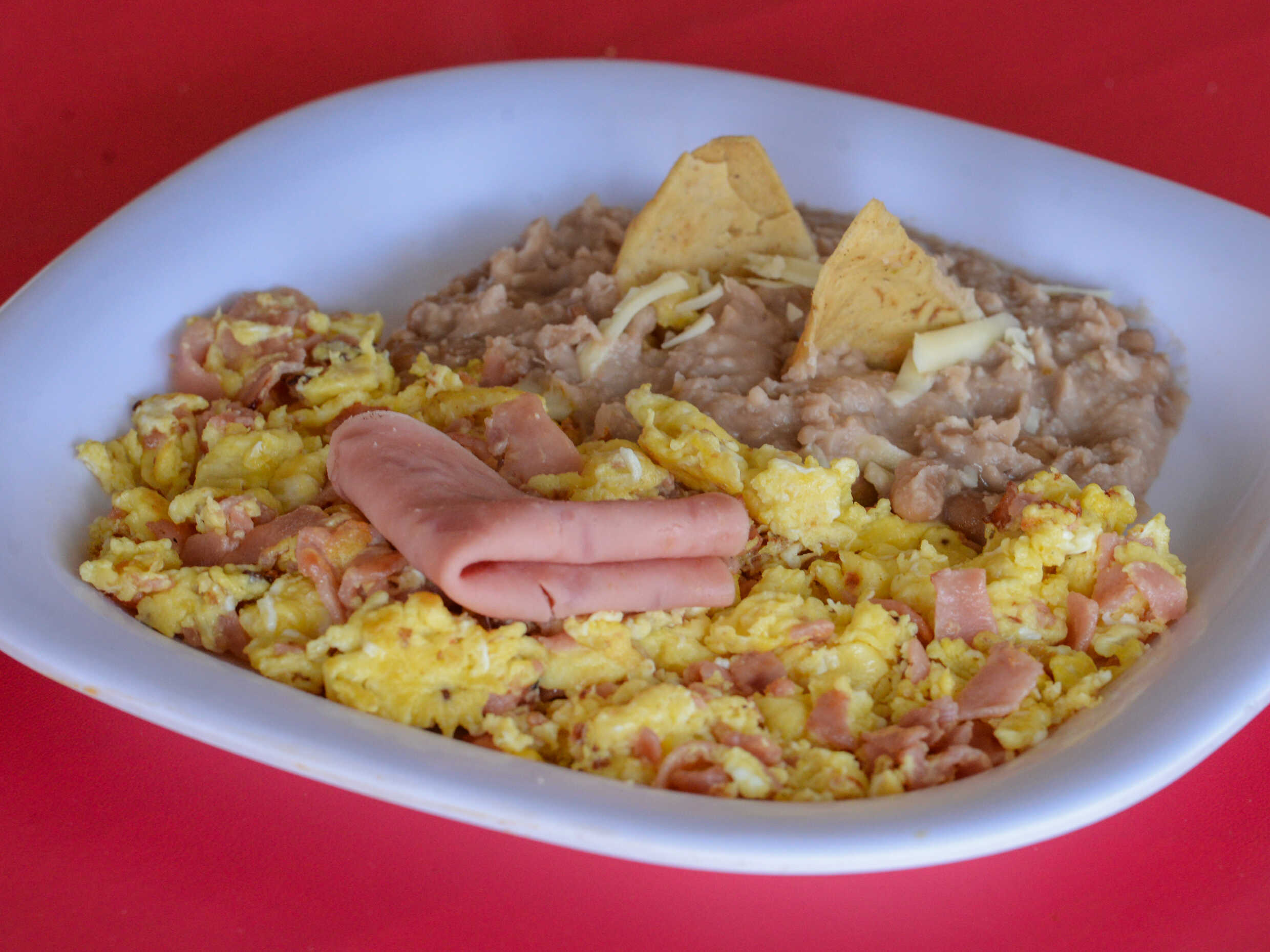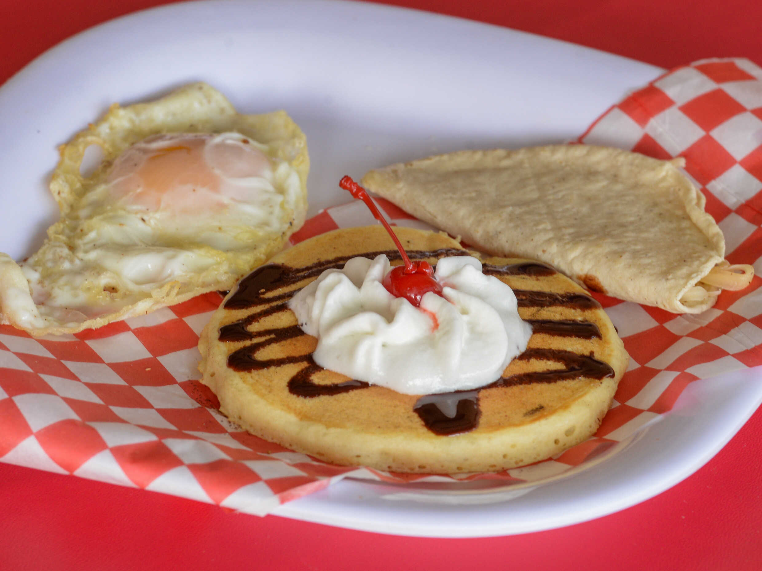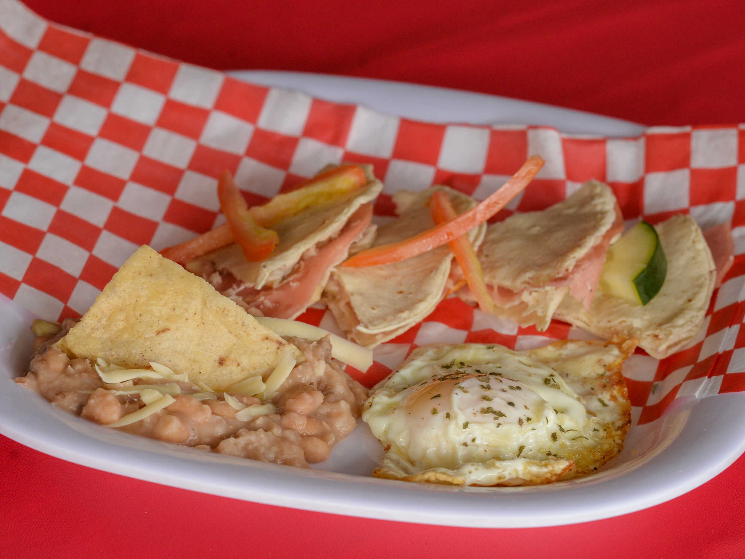 1 huevo estrellado o revuelto, 1 mini hot cake y una quesadilla.