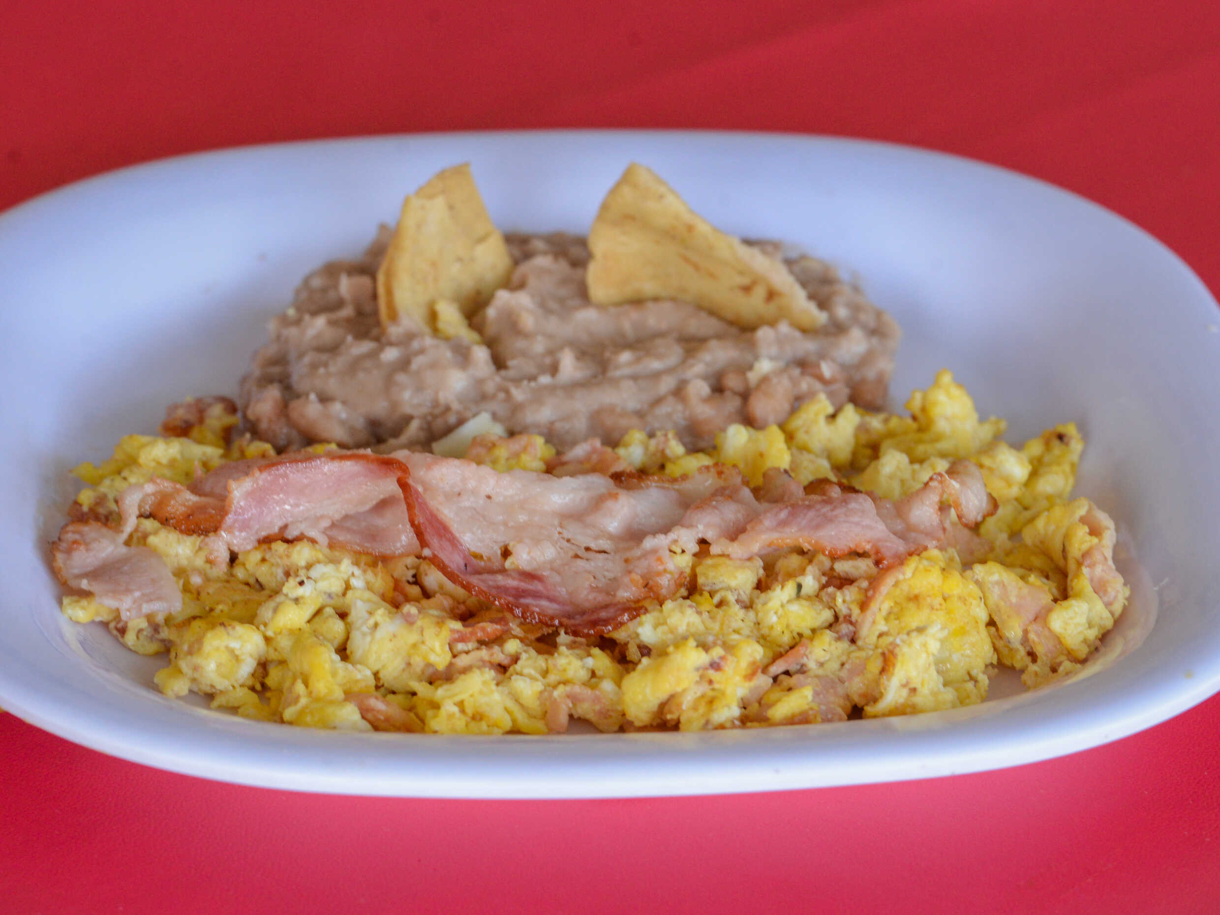 2 Huevos estrellados montados sobre tortilla frita, acompañados de bistec y frijoles refritos, incluye café.