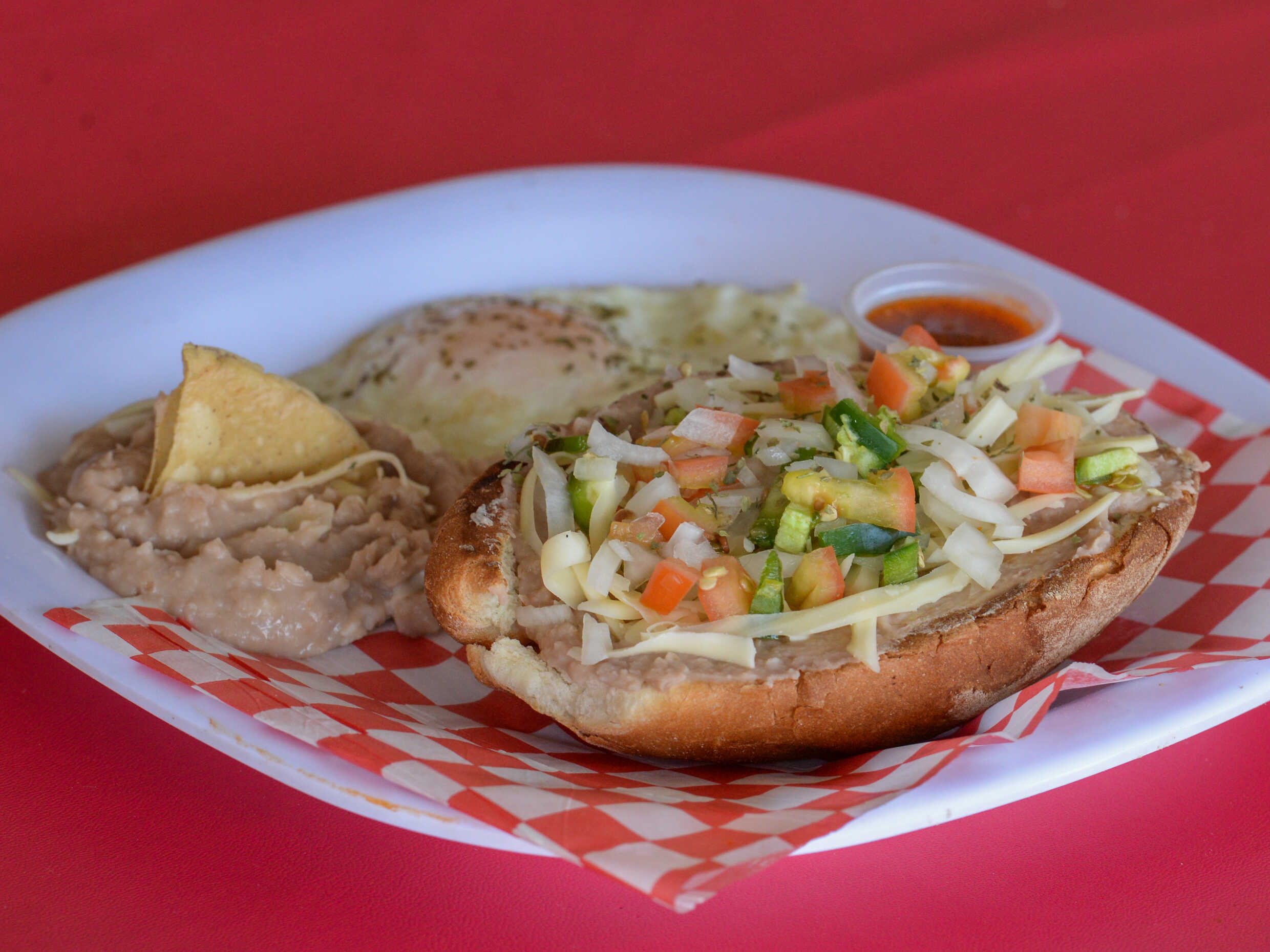 1 Mollete solo una tapa, 1 huevo estrellado acompañado de frijoles refritos.