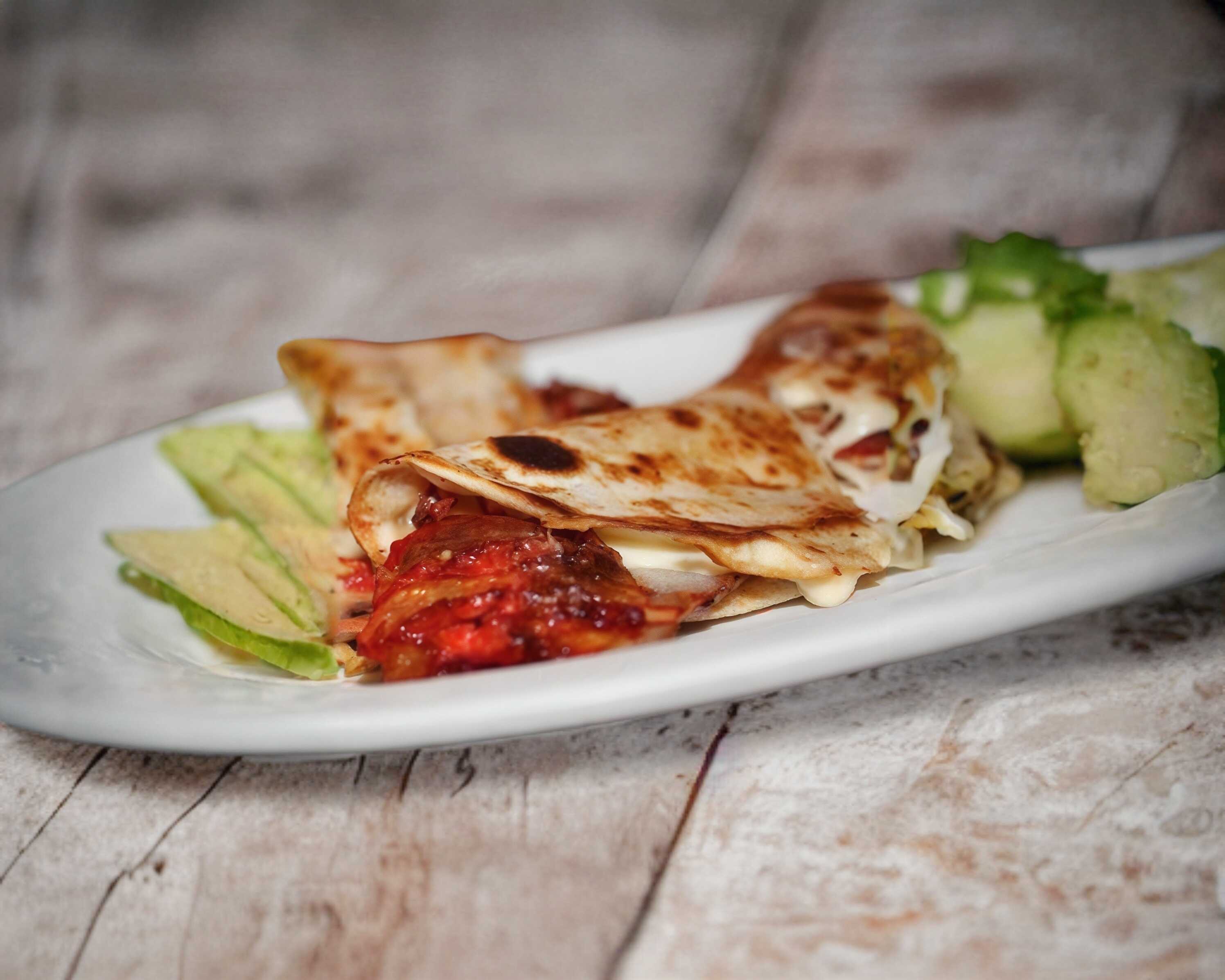 Deliciosa quesadilla de harina doblada rellena de carne al pastor.