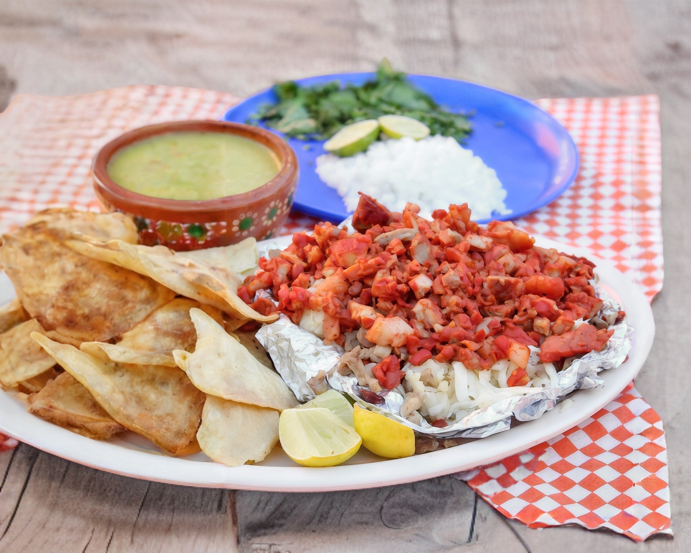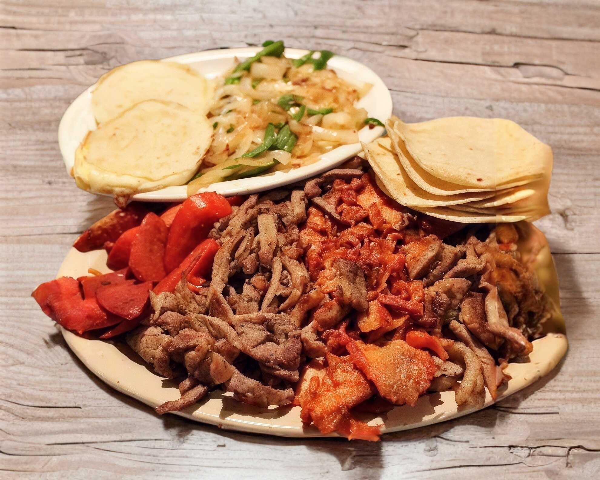 Costilla, bistec preparados a la plancha con jalapeño y cebolla asada acompañadas de dos quesadillas de tortilla de maíz.