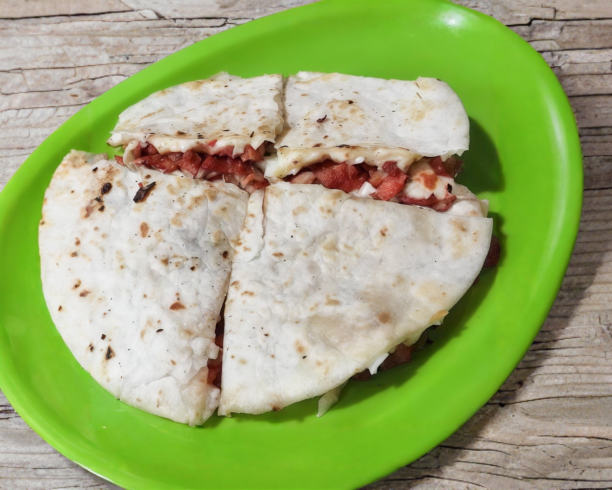 Deliciosa quesadilla de harina rellena de carne al pastor y alambre.