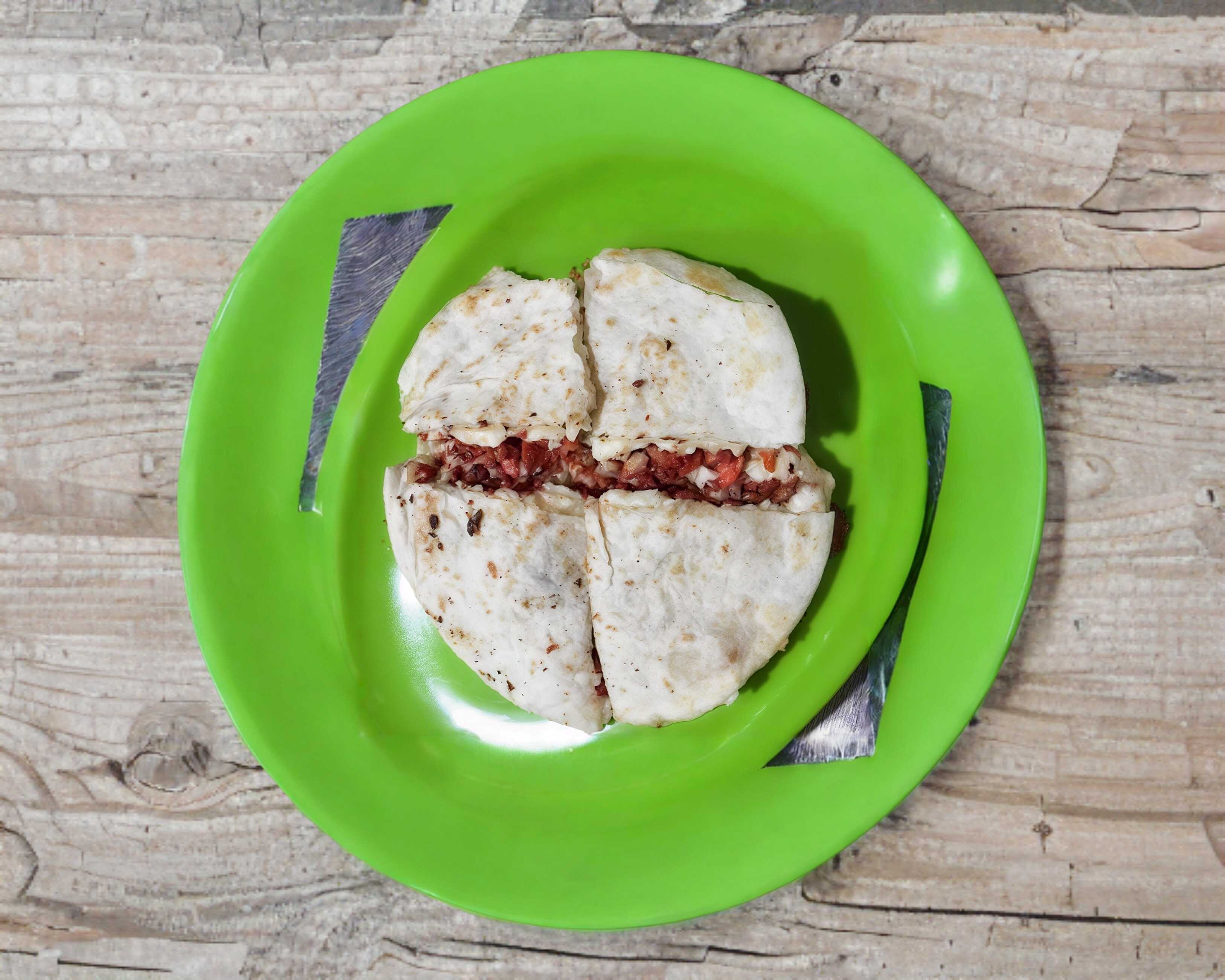 1 Deliciosa quesadilla de harina dividida en 4 porciones, rellena de queso y carne al pastor.