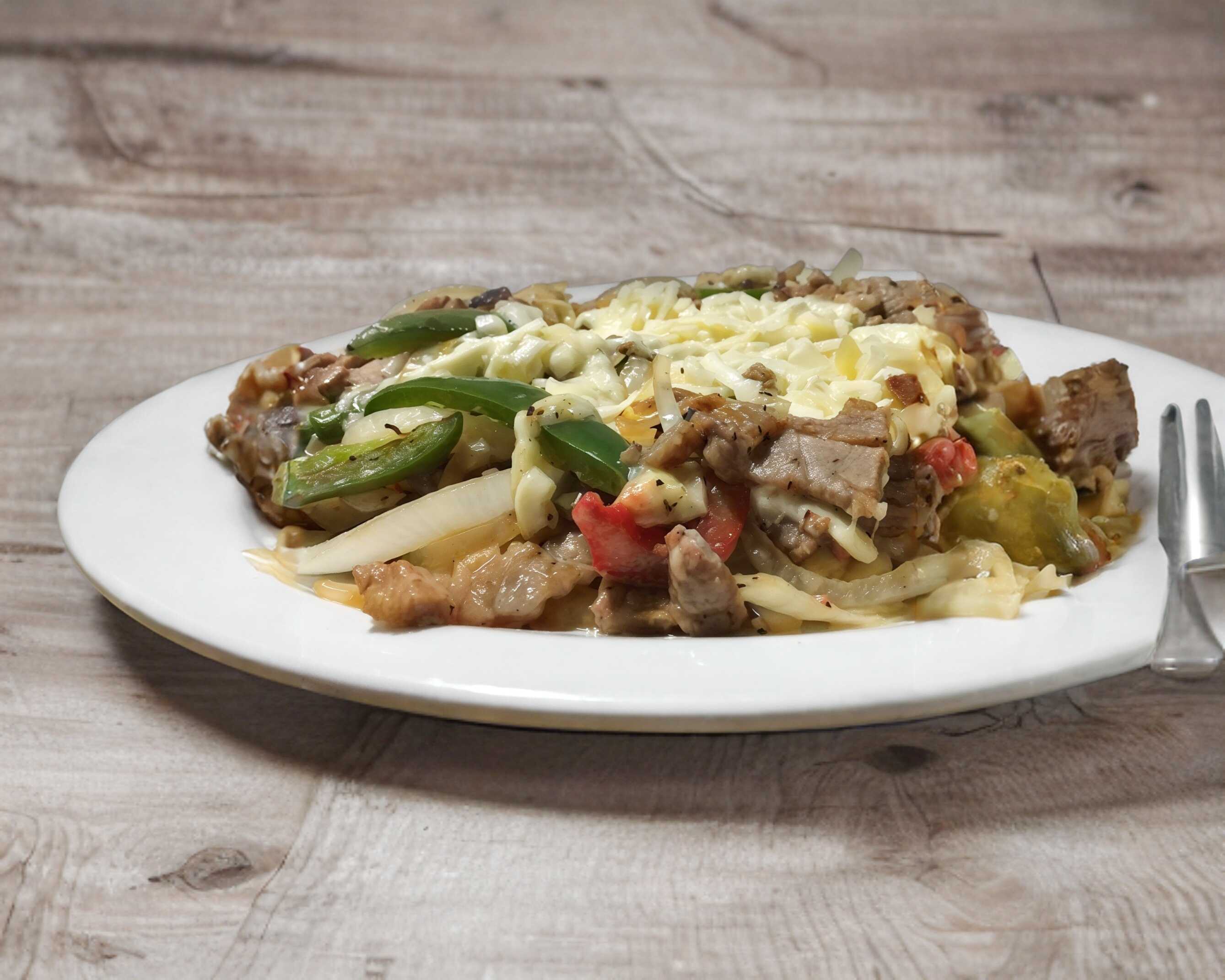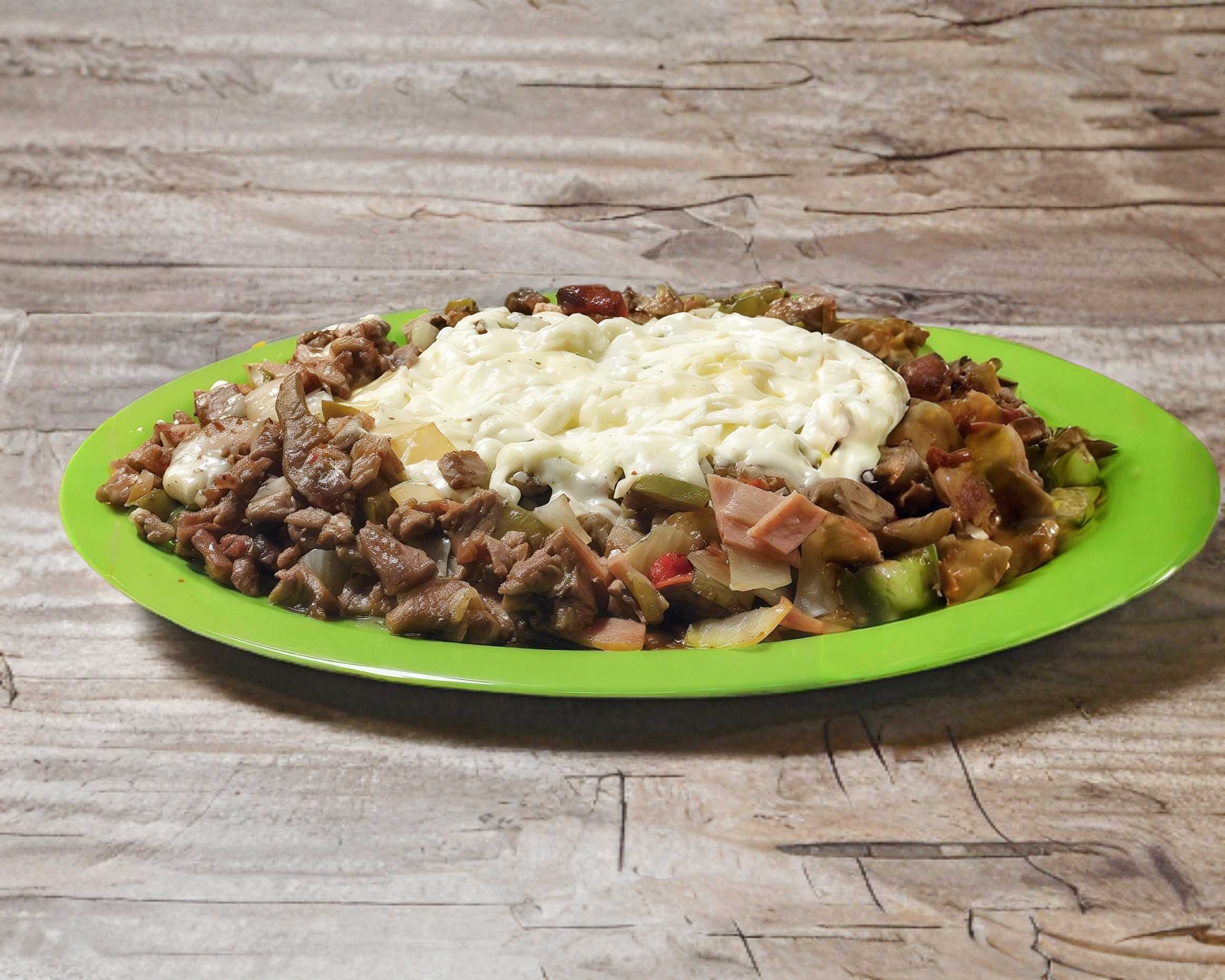 Carne de bistec con pimiento, cebolla, jamón y tocino gratinado con queso.