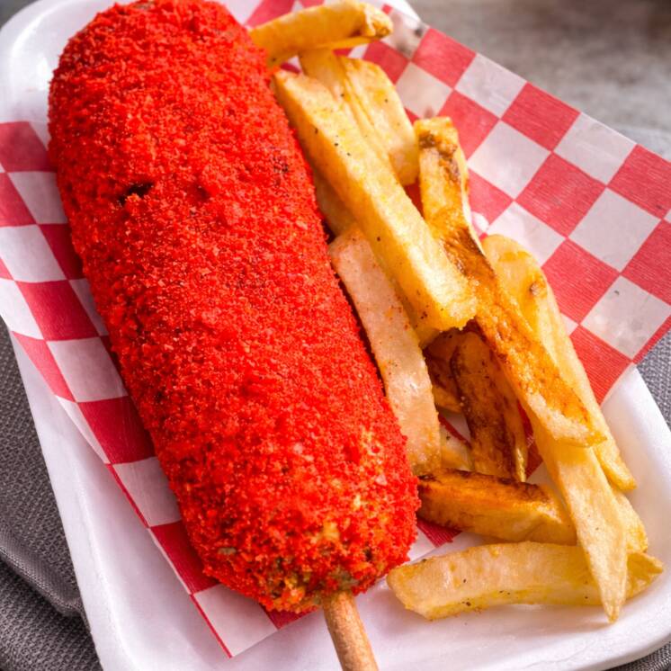 Banderilla rellena de queso, crujiente por fuera y suave por dentro, empanizada con Cheetos Flamin’ Hot para un sabor intenso y picosito que no vas a olvidar 🔥