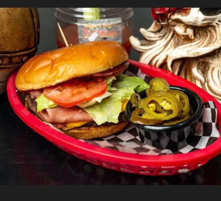 Hamburguesa con pan de mantequilla, 100 gramos de carne de sirloin, queso americano, queso crema, 1 gr de jamón (tajada), 10 gramos de tocino, lechuga, tomate y aderezos tales como mayonesa, cátsup y mostaza con pan a elegir.