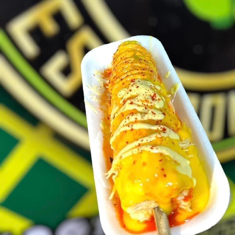 Mantequilla, crema, queso chihuahua, mayonesa, limón, empanizado con polvo de papas a elegir, bañado en aderezo amarillo.