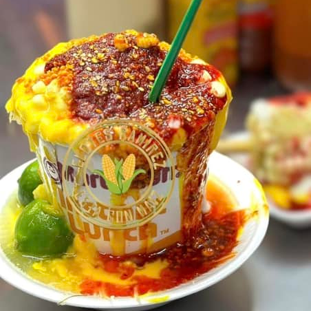 Vaso de elote desgranado con mantequilla, crema, queso chihuahua, mayonesa, limón, rodeado de papitas a elegir, chorreado con aderezo amarillo y cualquiera de nuestras salsas.