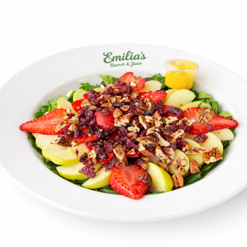Una explosión de frescura que combina nuestro mix de lechugas (crespa, romana y lisa) con láminas de manzana crujiente, fresas de temporada y arándanos dulces.