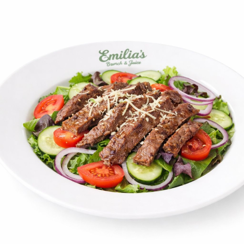Jugosa carne de res sellada a la plancha, servida sobre una cama de mix de lechugas (crespa, romana y lisa). El sabor se eleva con trocitos de queso parmesano, cebolla