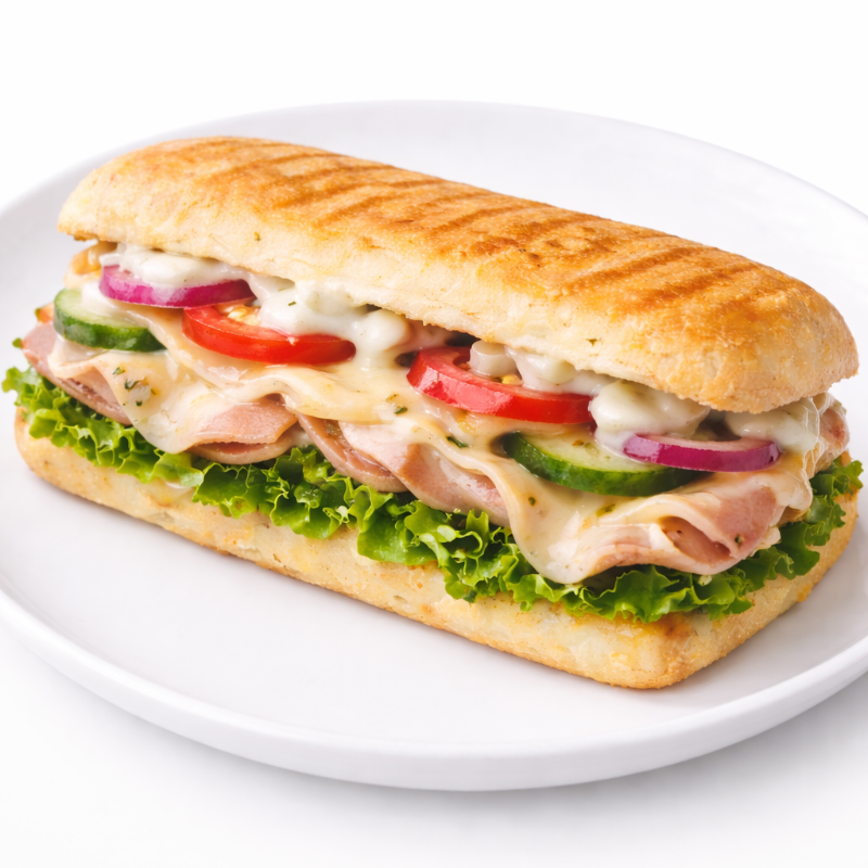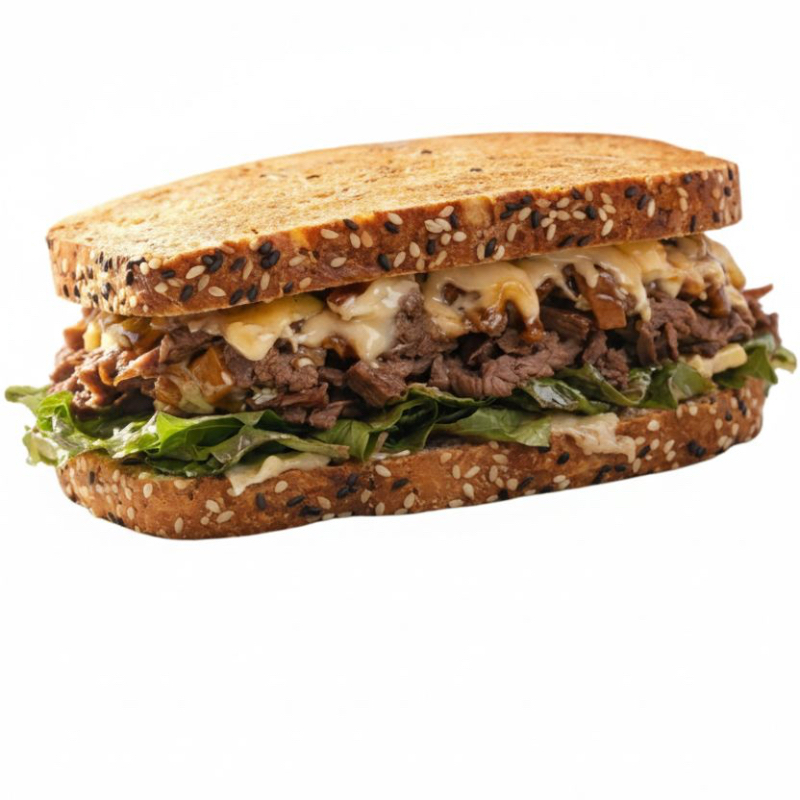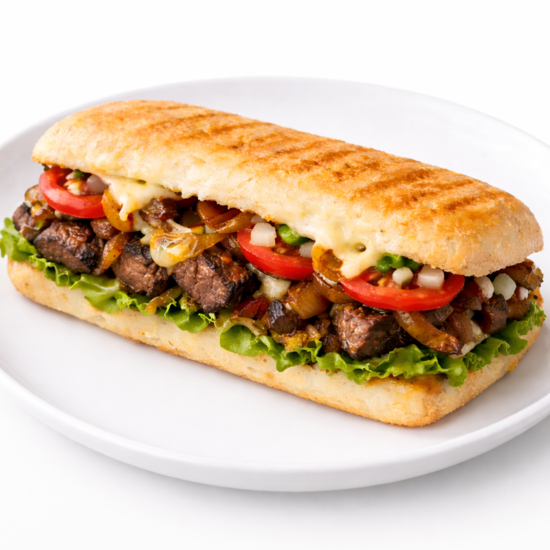 Cortes de carne de res sellados a la plancha y mezclados con el dulce sabor de nuestra cebolla caramelizada artesanal. Servido en pan panini crujiente con queso gratinado fundido, vegetales frescos (zanahoria, tomate y cebolla) y una doble combinación de aderezos: el especial de la casa y el toque fresco del ranch. Una explosión de sabores dulces y salados. Recomendación del Emilia´s