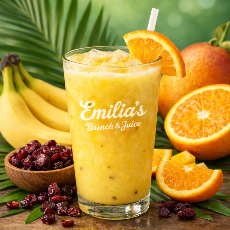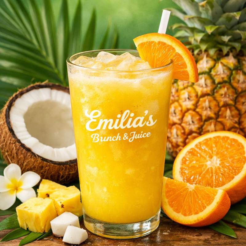 La frescura de la naranja se fusiona con la dulzura de la piña y el aroma inconfundible del coco natural. Un jugo frutal, lleno de energía y sabor para acompañar tu brunch favorito. Exótico, ligero y revitalizante.
