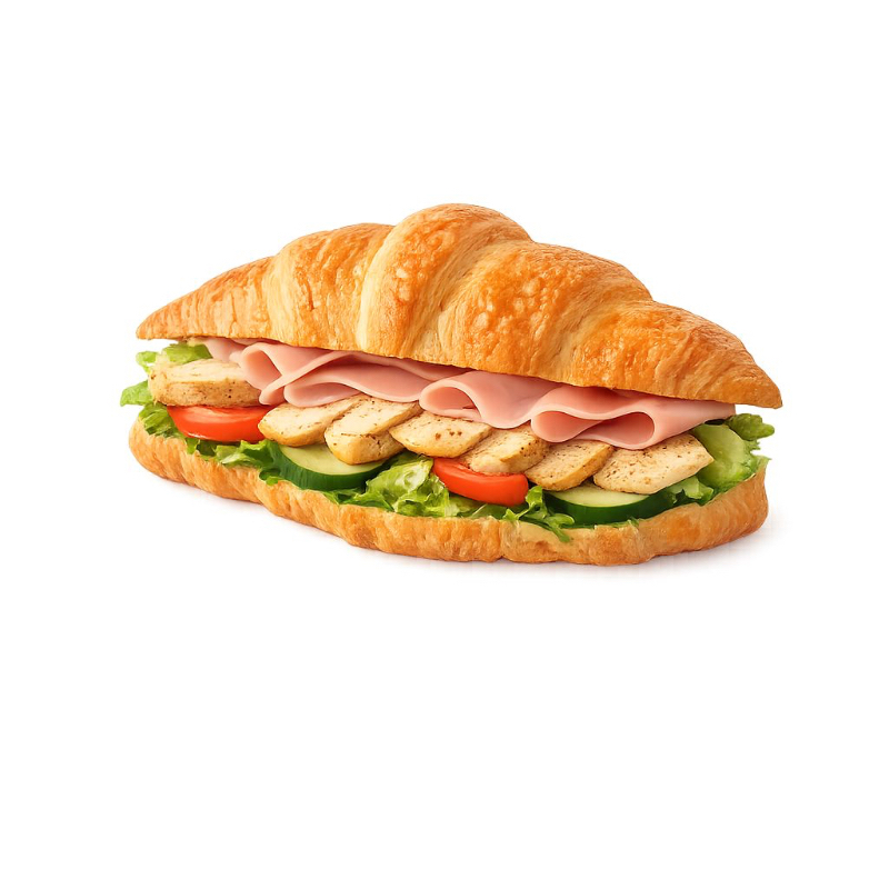 Cuernito relleno de pechuga de pollo a la plancha, jamón, lechuga italiana y tomate fresco. Una combinación clásica, fresca y lista para llevar.