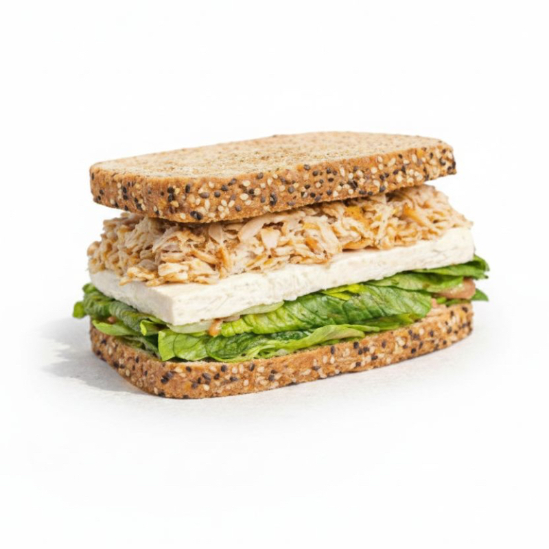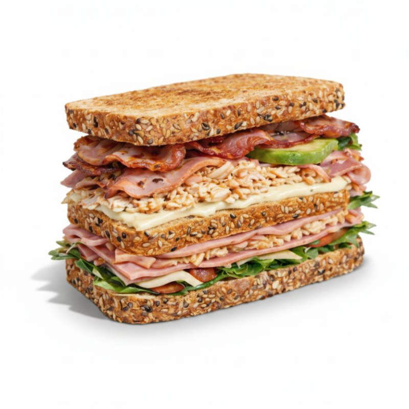 La combinación perfecta de proteínas y vegetales frescos. Tres pisos de pan artesanal tostado rellenos de pollo, jamón y tocino ahumado, con el toque refrescante y crujiente del pepino y la lechuga. Un sándwich balanceado, jugoso y lleno de energía para tu día.