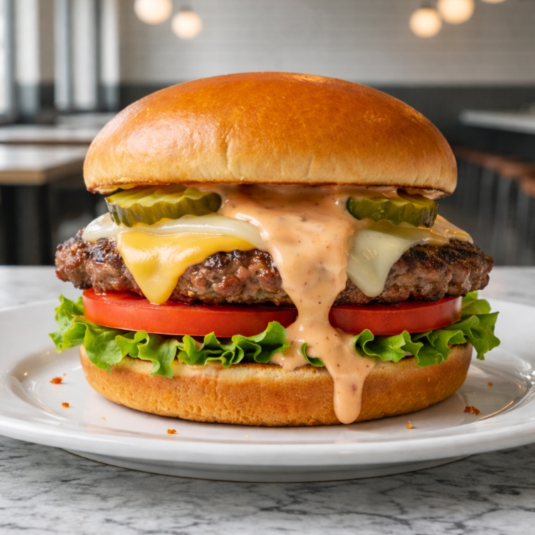 Nuestra hamburguesa insignia: jugosa carne de res 100% artesanal, preparada con nuestra receta secreta, fundido de queso americano y coronada con crujiente tocino. Servida sobre un pan brioche suave y mantequilloso, con el toque crujiente de la lechuga italiana, tomate fresco y cebolla, todo bañado con nuestro aderezo especial de la casa.