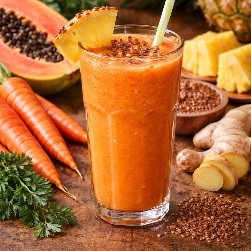 La mezcla perfecta para sentirte ligero y con energía. Combinamos la suavidad de la papaya y la fibra de la linaza con el toque refrescante de la piña y el dulzor de la zanahoria. El jengibre fresco aporta el toque final para mejorar la digestión y desinflamar. "Rico en fibra natural y Omega-3".