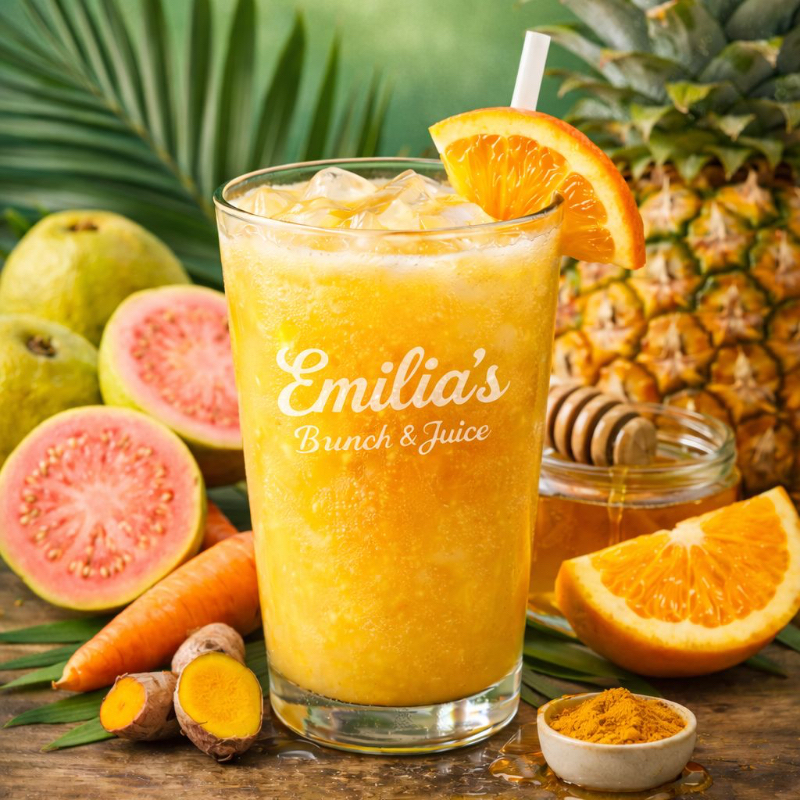 Fortalece tu cuerpo con esta poderosa mezcla diseñada para elevar tus defensas. Combinamos la vitamina C de la guayaba y la naranja con las propiedades antiinflamatorias de la cúrcuma fresca y el toque digestivo de la piña. Todo suavizado con miel pura de abeja. Un elixir dorado, refrescante y protector.
