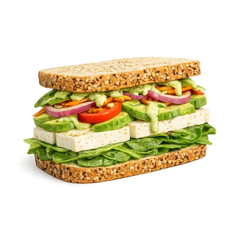Sándwich fresco con queso panela, aguacate, espinacas y vegetales seleccionados (lechuga italiana y pepino). Realzado con nuestra mezcla de aderezos de la casa.