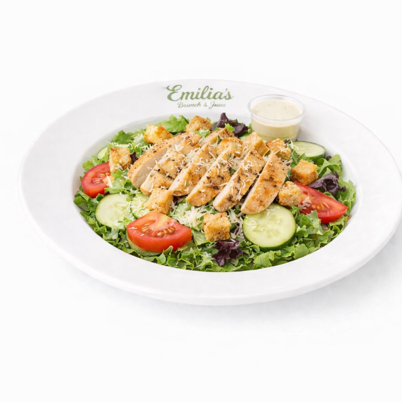 Jugosa pechuga de pollo a la plancha con queso panela, vegetales seleccionados (lechuga italiana y pepino) aderezos. Una opción clásica, rica en proteína.