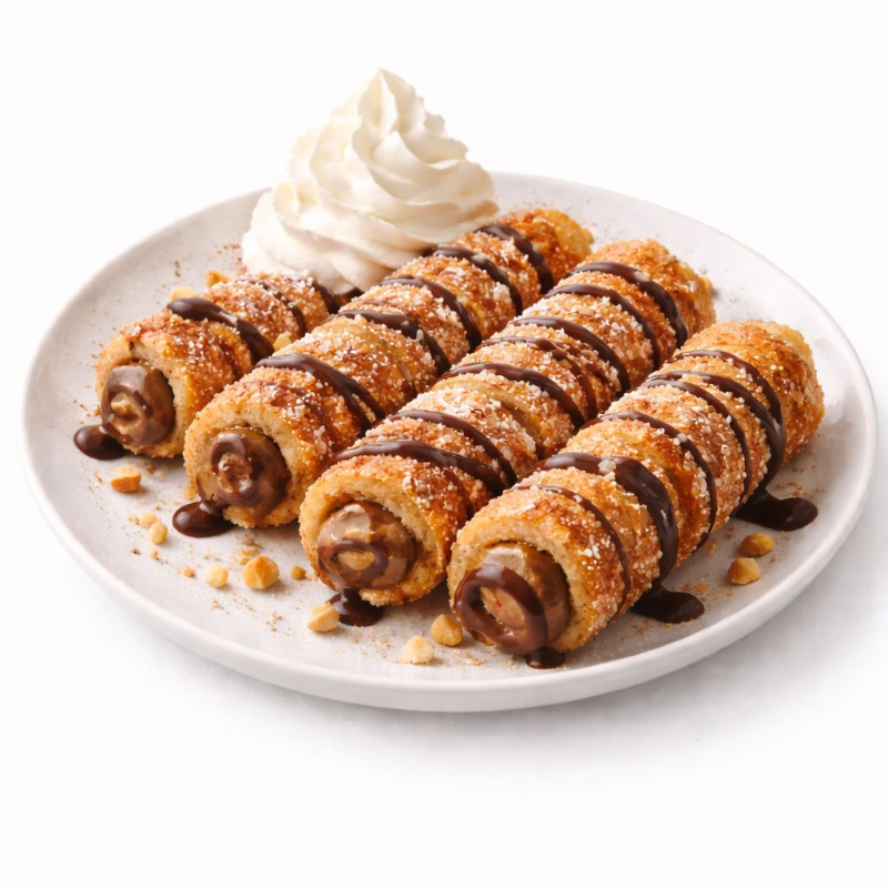 Pan suave enrollado y relleno de crema de avellanas, dorados en mantequilla con una costra de azúcar-canela. Servidos con el toque fresco de fresas de temporada y crema batida. Un bocado dulce, ligero y lleno de sabor.