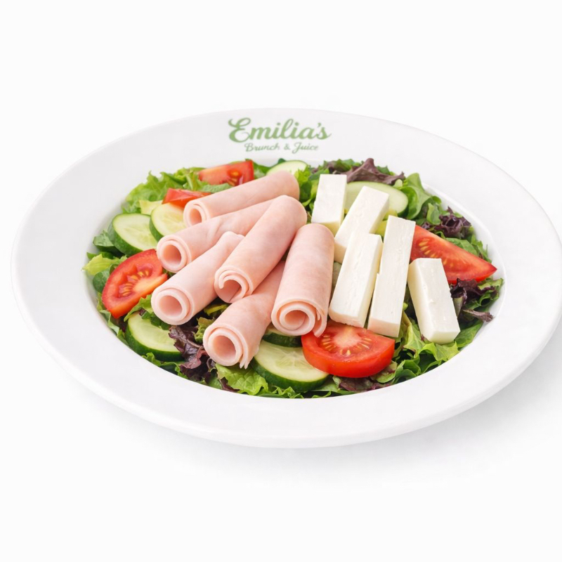 Una base ligera de mix de hortalizas (lechuga crespa, romana y lisa) acompañada de delicados rollitos de jamón de pavo premium y cubos de queso panela fresco.