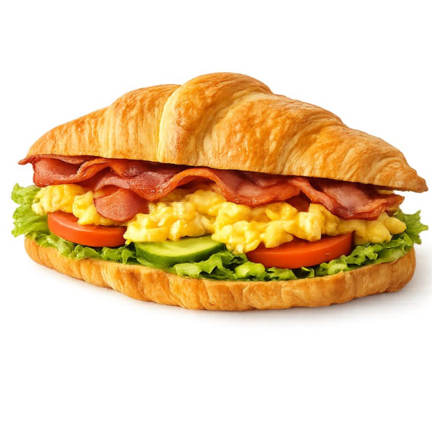 El desayuno icónico dentro de un cuernito: huevo revuelto estilo americano, suave y esponjoso, acompañado de tiras de tocino crujiente y dorado.