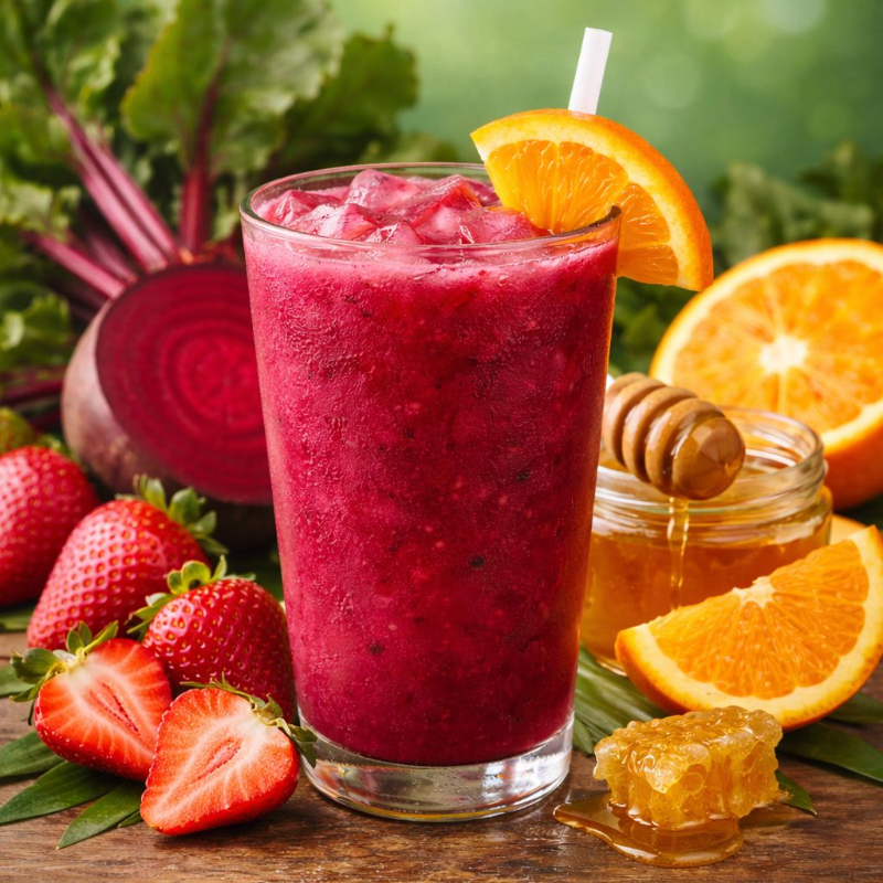 Nuestra mezcla especial de betabel y fresas frescas con base de jugo de naranja natural y miel. Una opción deliciosa, cargada de vitaminas y con una textura ligera. Rico en hierro y antioxidantes, es el impulso natural que tu día necesita.