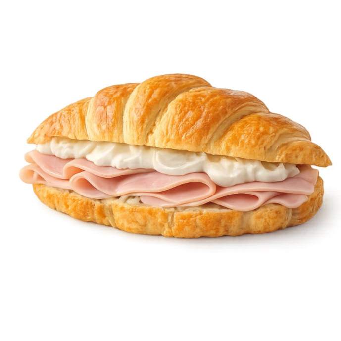 Nuestro cuernito de mantequilla relleno de jamón de pavo, queso crema y queso asadero gratinado. Una opción fresca, deliciosa y perfecta para llevar contigo a donde vayas.