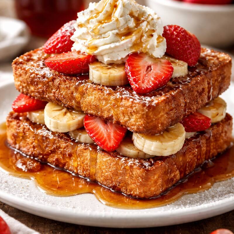 Doble rebanada de pan de masa madre, bañada en mantequilla y empanizada en una costra de azúcar morena caramelizada. Servida con rodajas de plátano fresco, fresas de temporada y una suave nube de crema batida. El equilibrio perfecto entre lo rústico y lo dulce.