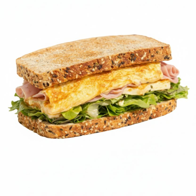 Omelette suave y esponjoso relleno de jamón y queso derretido, acompañado de la frescura crujiente de la lechuga italiana y pepino. Realzado con un sutil toque de aderezo de la casa.