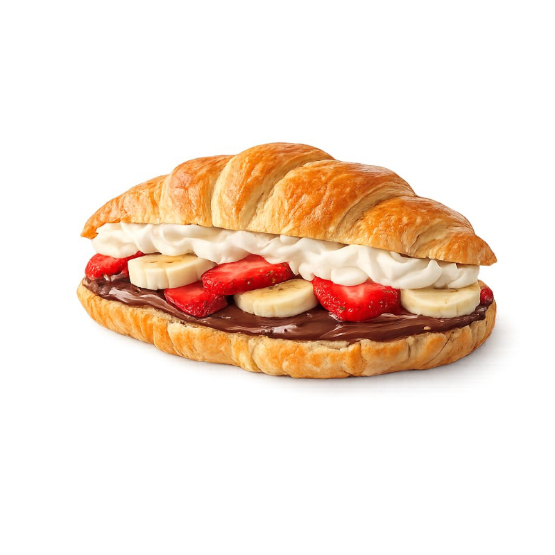 Nuestro cuernito artesanal de mantequilla, generosamente relleno de suave crema de avellanas, láminas de plátano fresco y fresas de temporada. Coronado con una montaña de crema batida para una experiencia dulce y reconfortante.