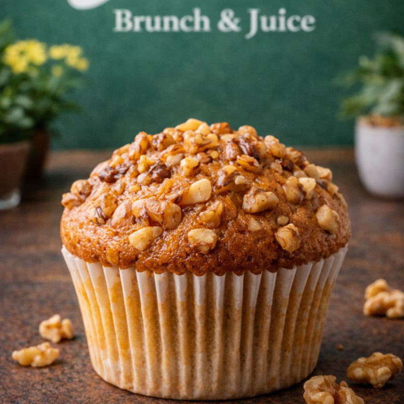 Esponjoso muffin horneado, preparado con una mezcla suave y aromática, lleno de trozos de nuez que aportan un sabor intenso y una textura ligeramente crujiente. Perfecto para acompañar un café, jugo o licuado, ofreciendo un equilibrio delicioso entre dulzura y el característico sabor de la nuez.
