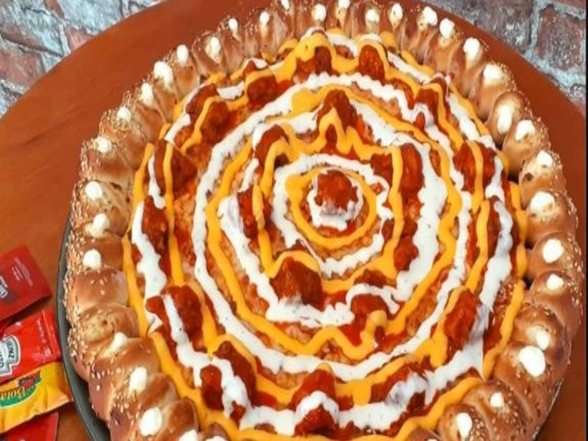 Pizza de deditos rellenos de queso crema con carne asada y aguacate.