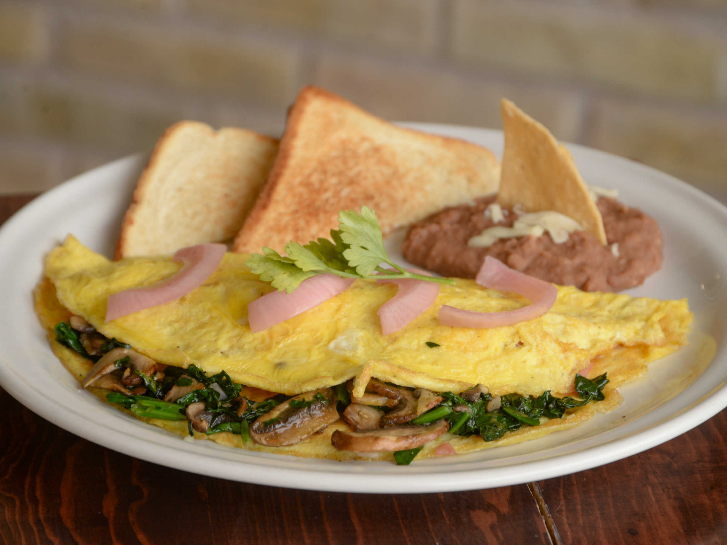 Omelette preparado con 2 huevos, relleno de espinacas y champiñones, acompañado de frijoles y pan tostado.