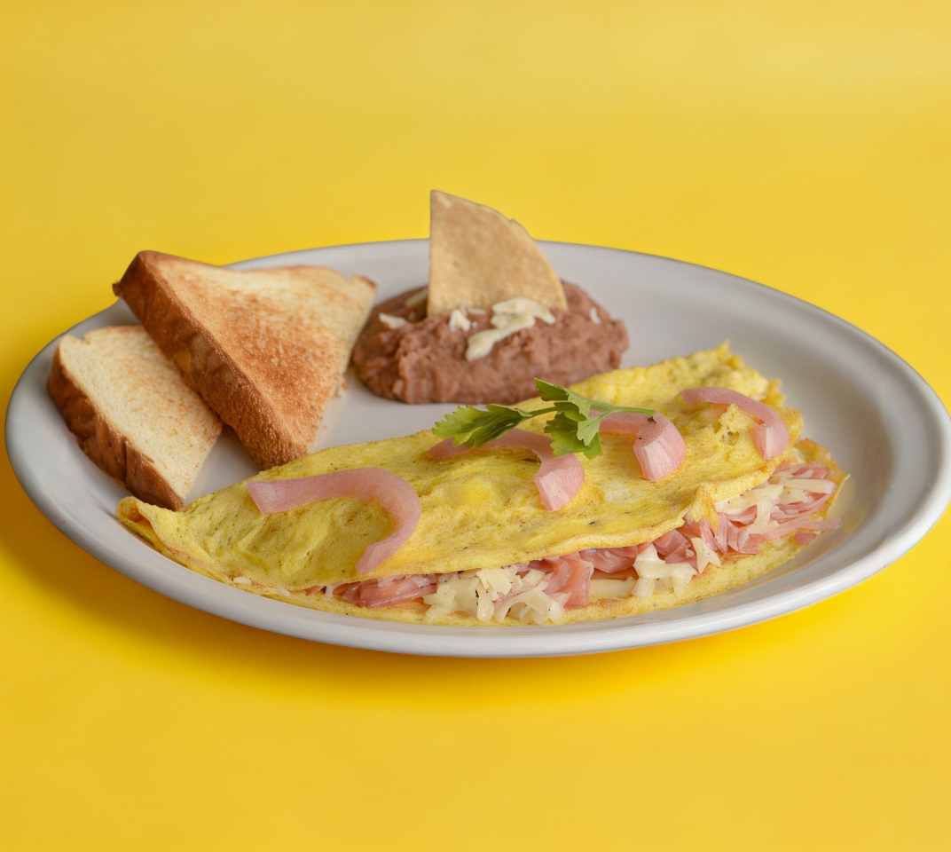 Omelette preparado con 2 huevos, relleno de jamón y queso, acompañado con frijoles y pan tostado.
