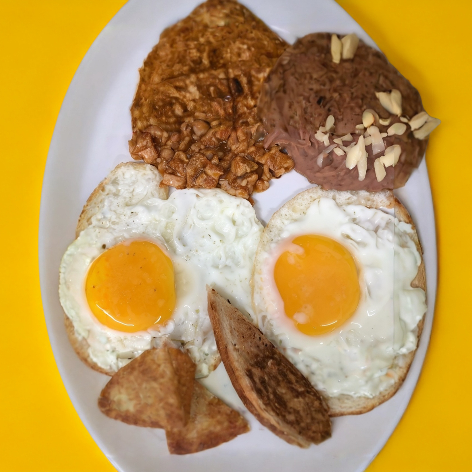 2 Huevos estrellados, 1 guiso a elegir, acompañado de frijoles y pan tostado.