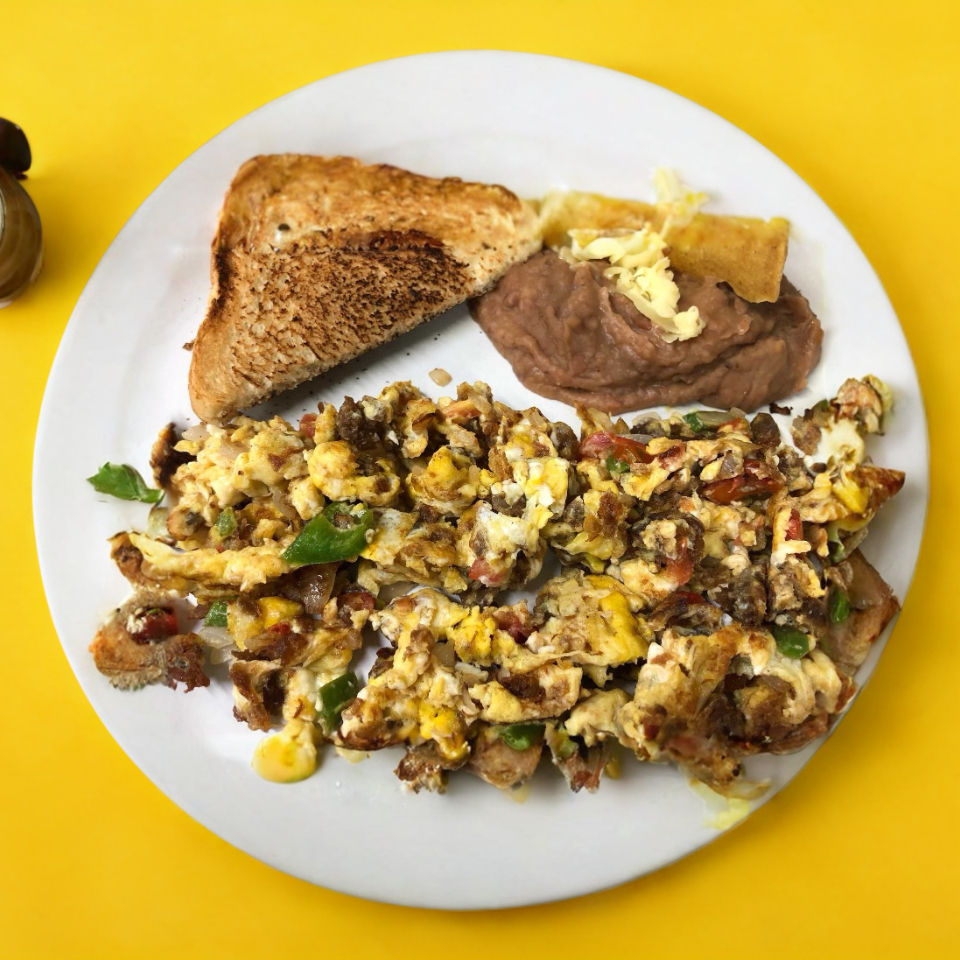 2 Huevos revueltos con jamón, acompañados de frijoles y pan tostado.